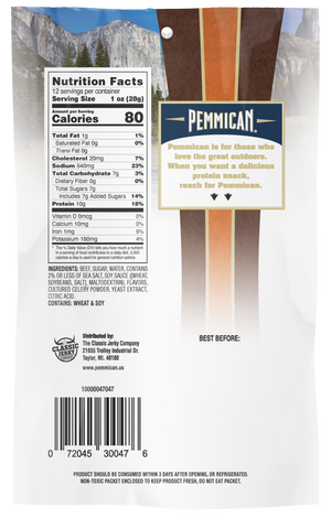 Pemmican® clean Label Premium Teriyaki Beef Jerky in a Giant-Sized package. With no artificial ingredients, flavors or colors our Teriyaki Beef Jerky is the true definition to the name Teriyaki. Seasoned to have the perfect balance of sweet and smoky, your taste buds will surely agree. It's perfectly bold, unique and will become one of your favorites from the very first bite! Pemmican offers a good source of protein with a daily serving of 10g protein.